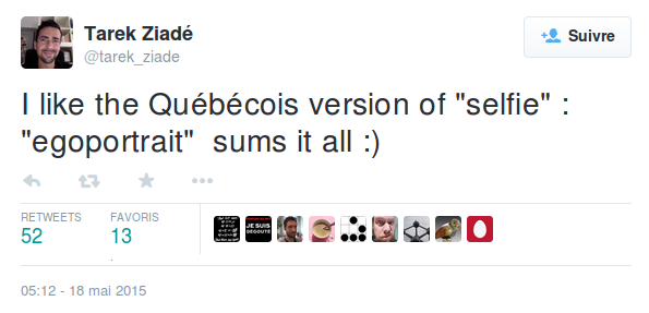 « I like the Québécois version of "selfie" : "egoportrait" sums it all :) »